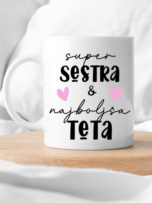 Keramična skodelica z napisom za super sestro in najboljšo teto.