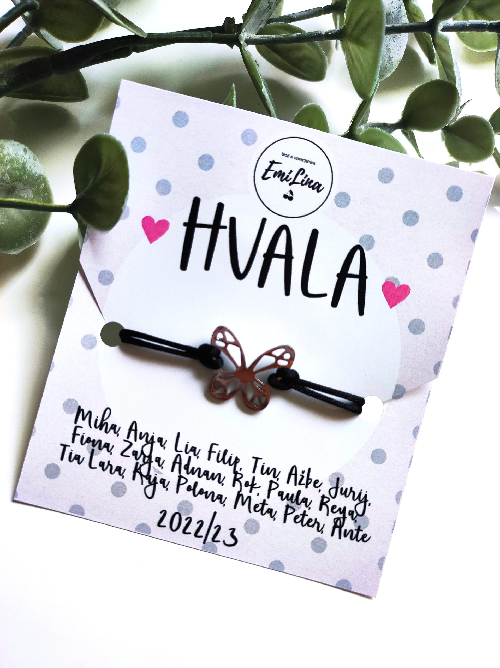Nastavljiva zapestnica z obeskom metulja iz nerjavečega jekla. V spodnji okvirček napišite ime skupine, razred, ime otroka ali imena vseh učencev.